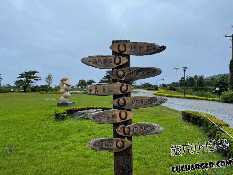 一入園區就可以看到指標指引著日出石、騎馬體驗、火鶴、天鵝、梅花鹿、鴕鳥、可愛動物、風箏區、花海區,