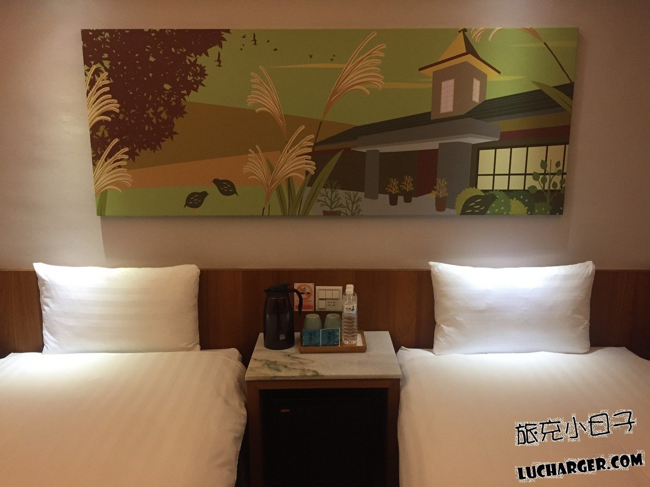 兩張單人床中間有一個小茶几,床頭還備有插座,蠻細心的!