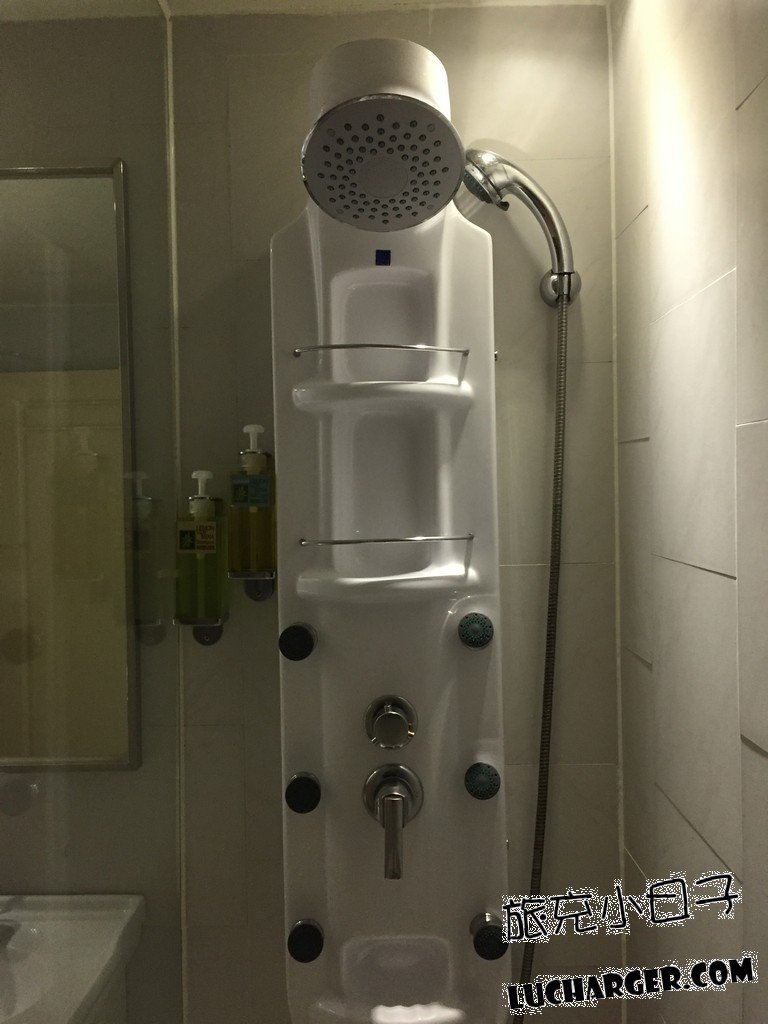 他的淋浴設備很特別,有花灑、蓮蓬頭,還有可以調成按摩的水柱,
